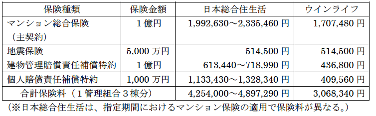 さて、現在契約しているマンション保険については2025年12月に満期を迎えることから、理事長協議会では、過去に当組合と契約実績のある日本総合住生活株式会社大阪支社と現在契約している株式会社ウインライフ京都北営業所の2社に対して、同一条件で12月以降のマンション保険の保険料について見積りを依頼しました。